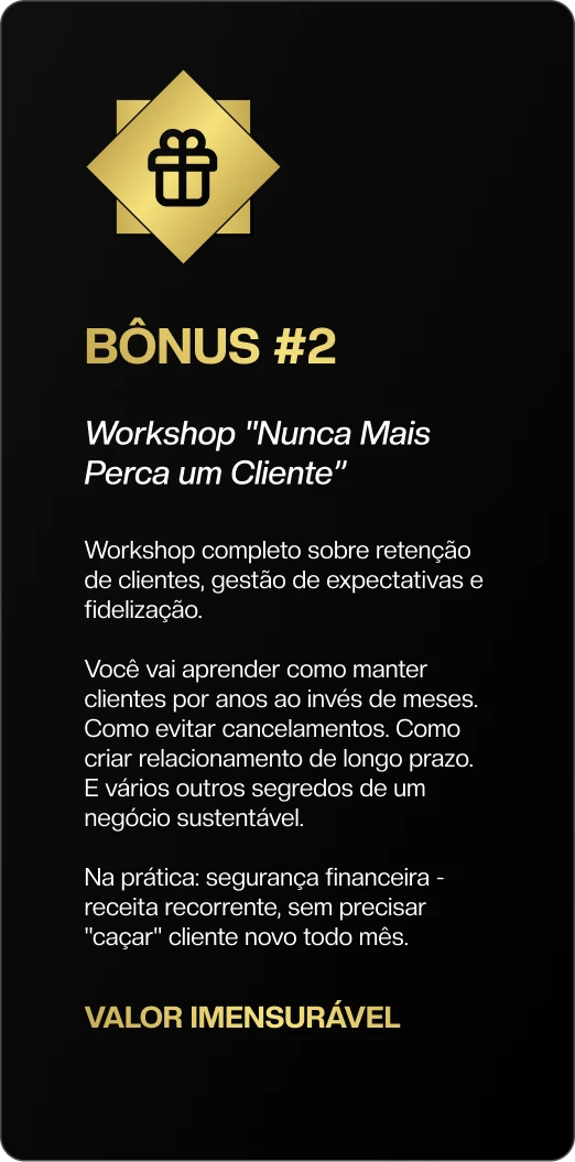 Você está 100% protegido pelas nossas duas garantias. Se não gostar do conteúdo nos primeiros 21 dias, devolvemos 100% do valor. E se aplicar tudo certinho e não tiver resultado em 180 dias, também devolvemos 100% + R$ 500 de bônus. Todo o risco está comigo.