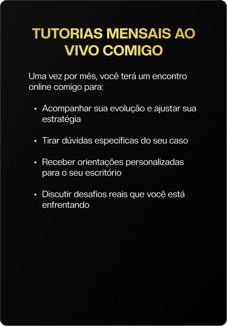 As aulas do Método são gravadas e imediatamente disponíveis para você assistir no seu ritmo. Mas você também terá acesso a tutorias mensais AO VIVO comigo, onde vou acompanhar sua evolução, tirar dúvidas e dar orientações personalizadas. É o melhor dos dois mundos!