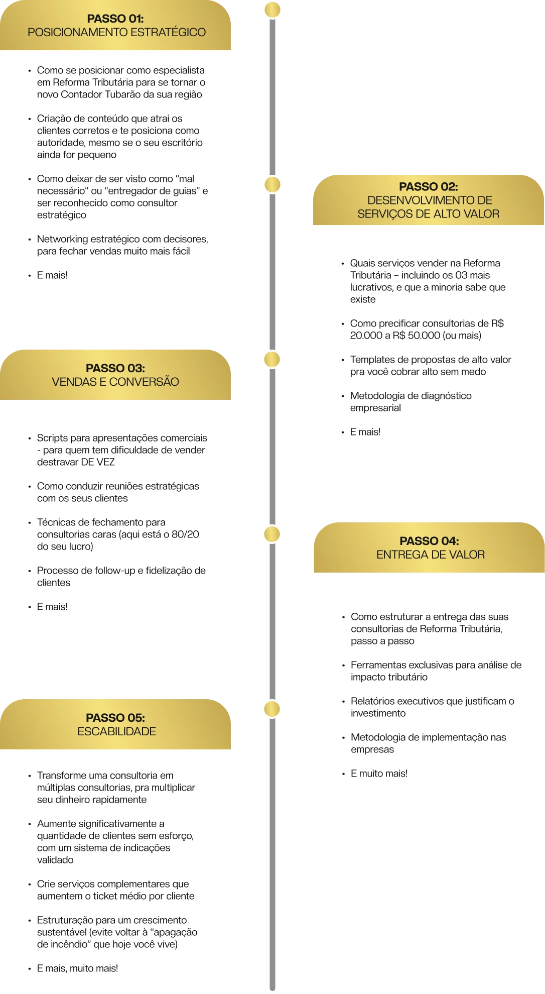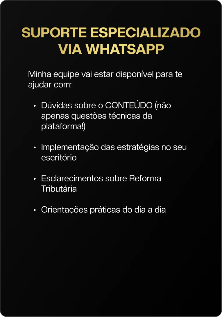 Essa insegurança é normal. Mas no Método você vai ter scripts prontos, técnicas de vendas validadas, e vai entender que não é sobre você – é sobre o VALOR que você entrega. Com a Reforma Tributária, empresas VÃO PRECISAR de consultoria. Você só precisa mostrar o impacto financeiro que seu serviço gera. E nós vamos te ensinar exatamente como fazer isso.