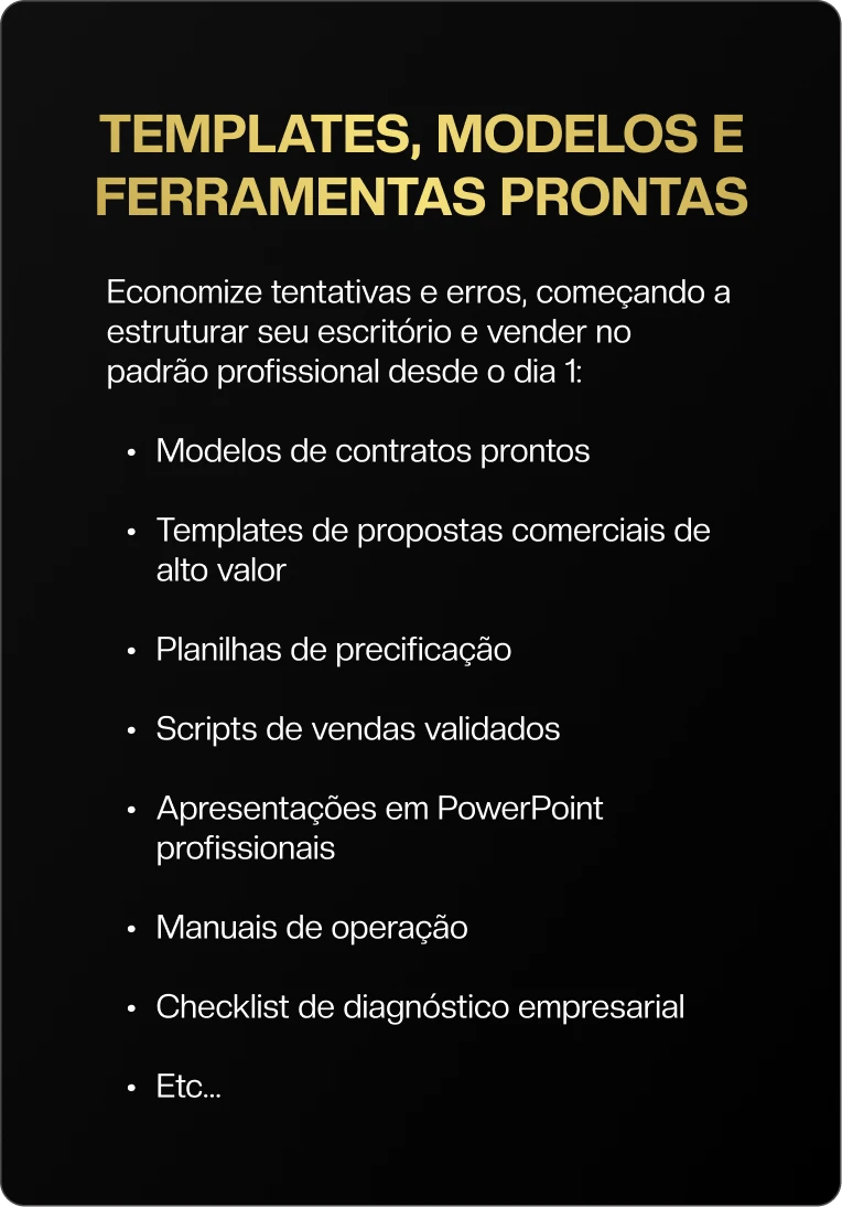 Não necessariamente! O Método serve para quem está começando do zero e também para quem já tem escritório consolidado. Você pode aplicar o conhecimento como autônomo, como funcionário de escritório que quer crescer, ou como dono de escritório que quer escalar.